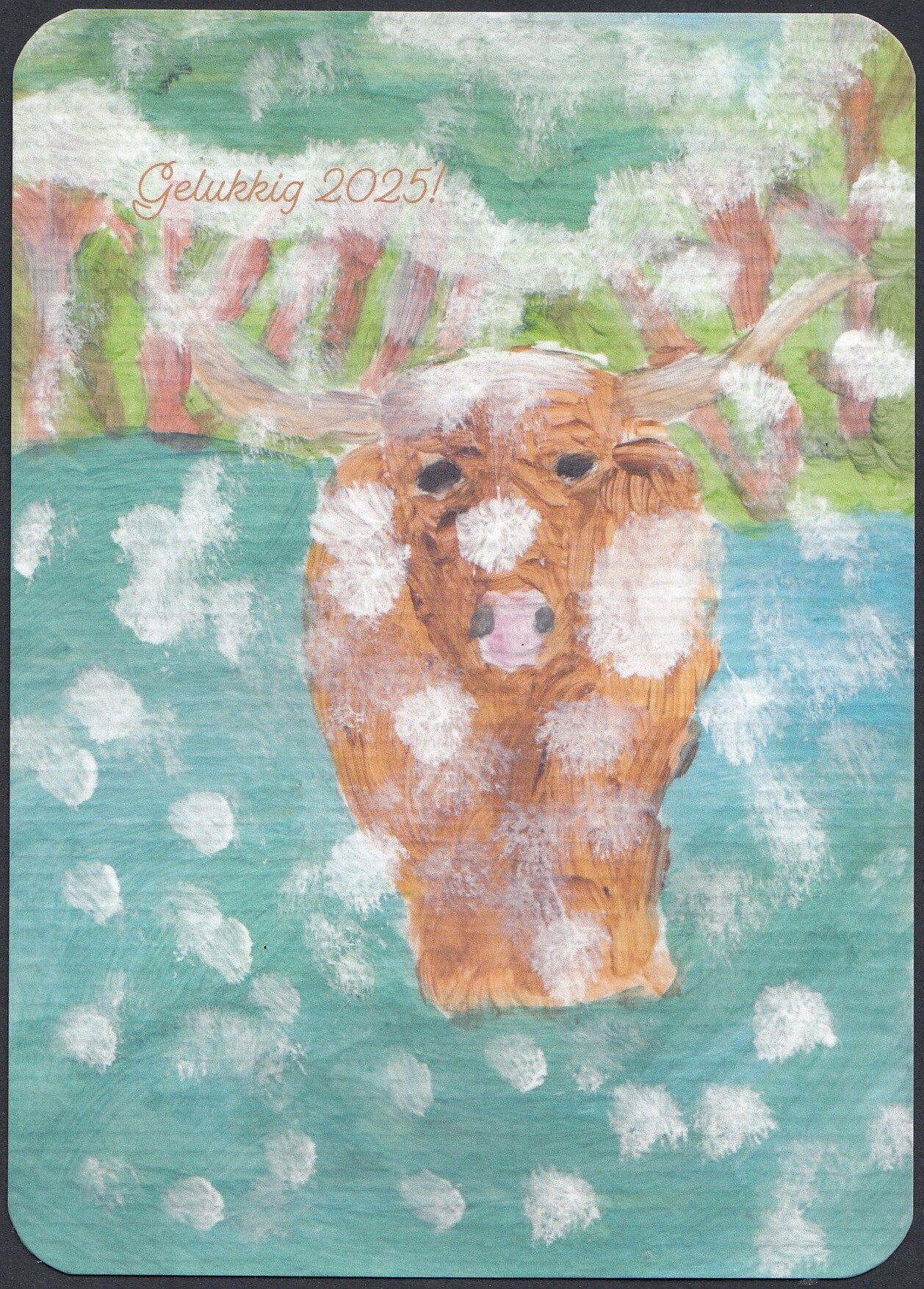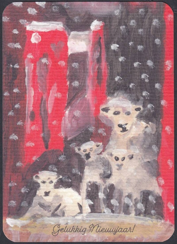 - Afbeeldingen: ezel en een hondje in de sneeuw, poes en mus in de sneeuw, schapen in de stal en een Schotse Hooglander in de sneeuw