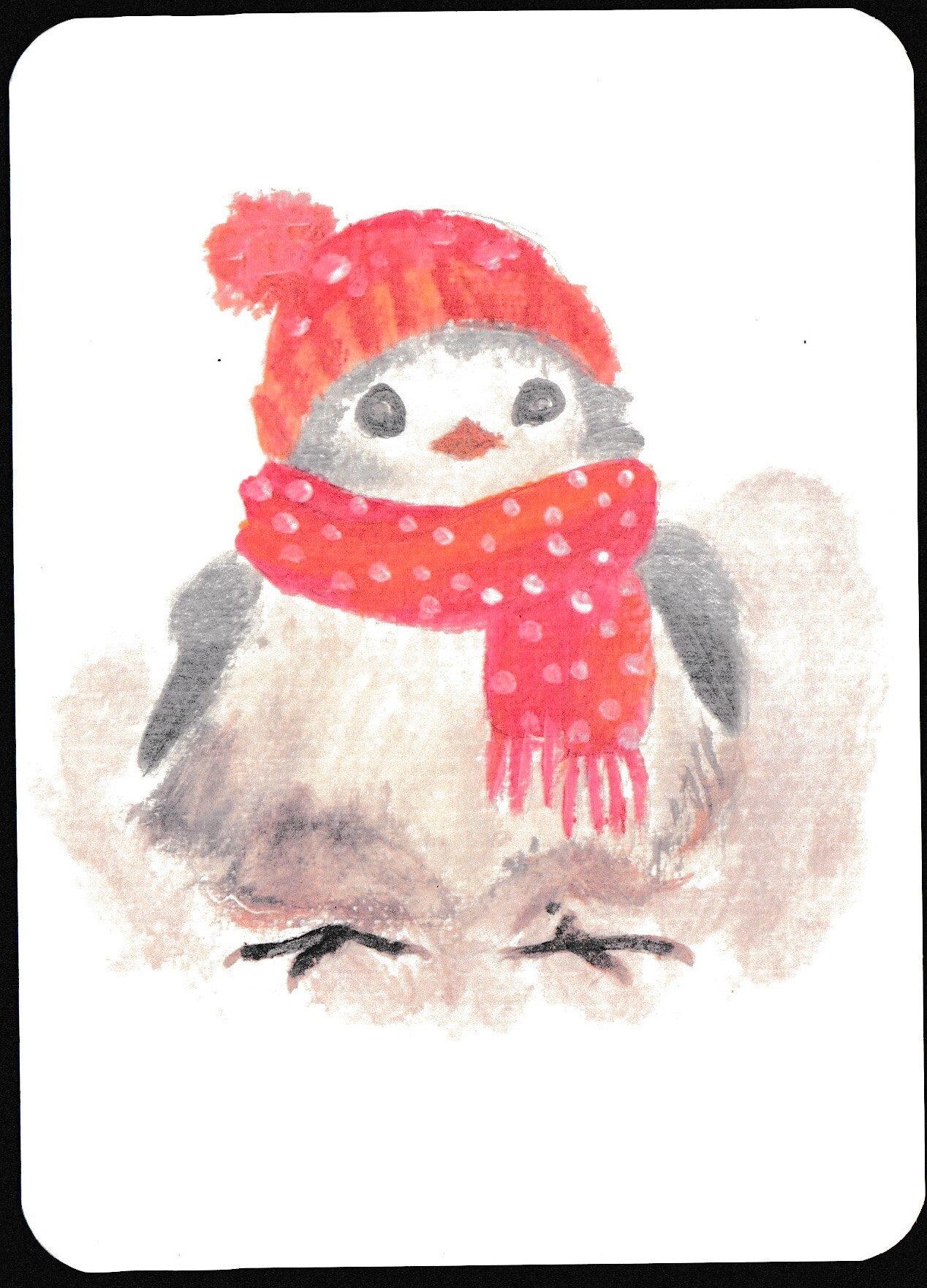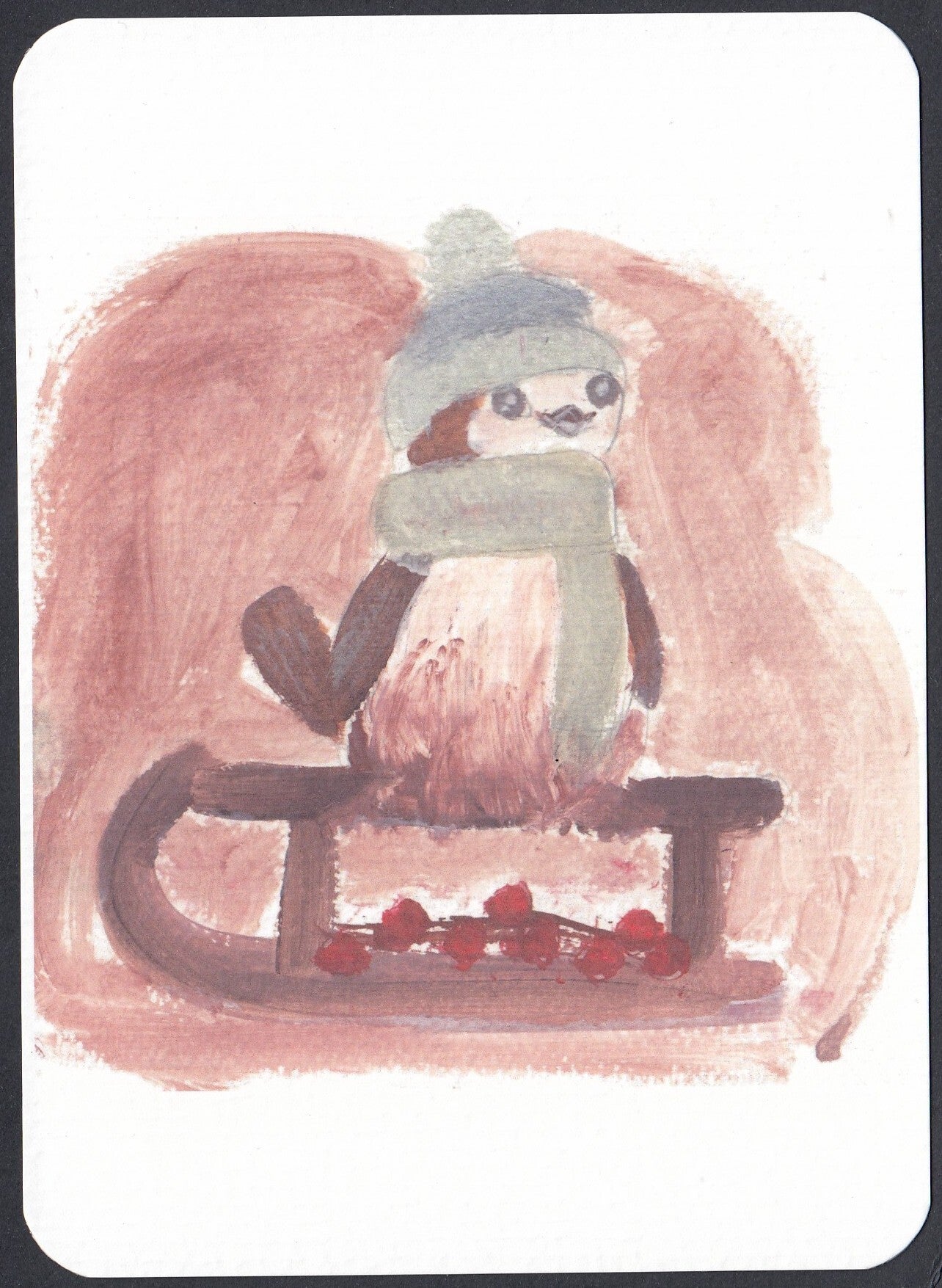 - set van vier prachtige winterkaarten met vogels erop geschilderd met mutsjes op